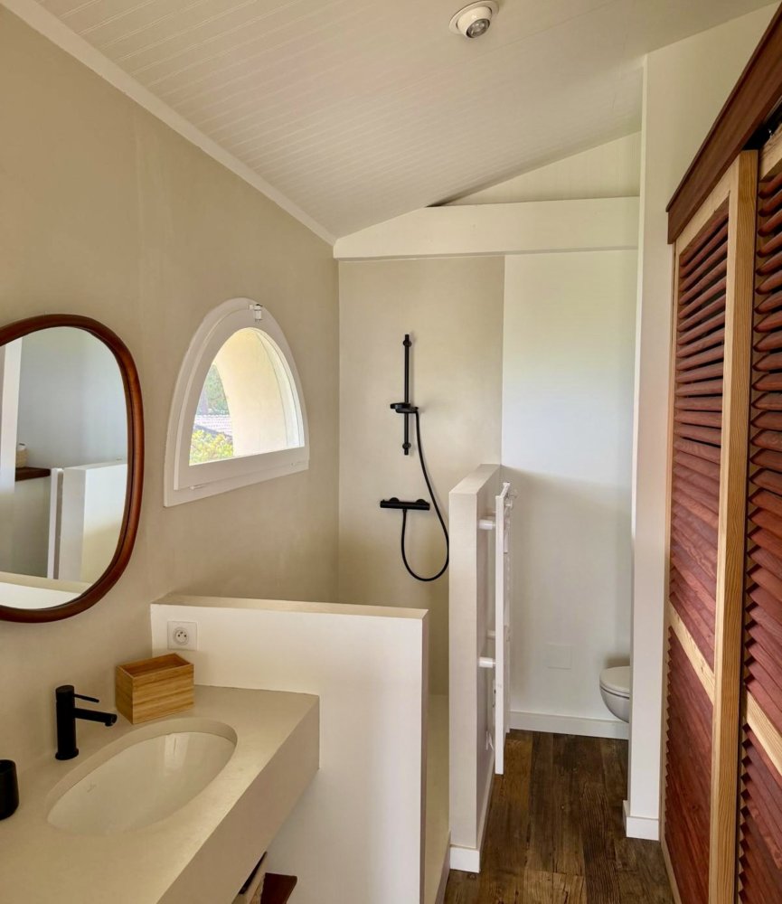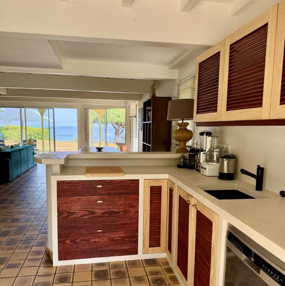 1) Haus im karibischen Stil für 8 Personen, 160 m²: Dies ist das Haupthaus, direkt am Wasser mit atemberaubendem Blick auf die Bucht. Im Erdgeschoss befinden sich ein geräumiges Wohnzimmer mit großen Schiebetüren zur Terrasse und Bucht, WLAN, TV, ein Essbereich mit Esstisch und offener Küche, ein separates WC und eine Waschküche.