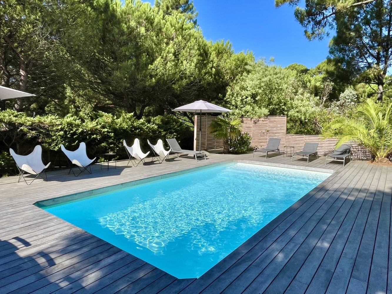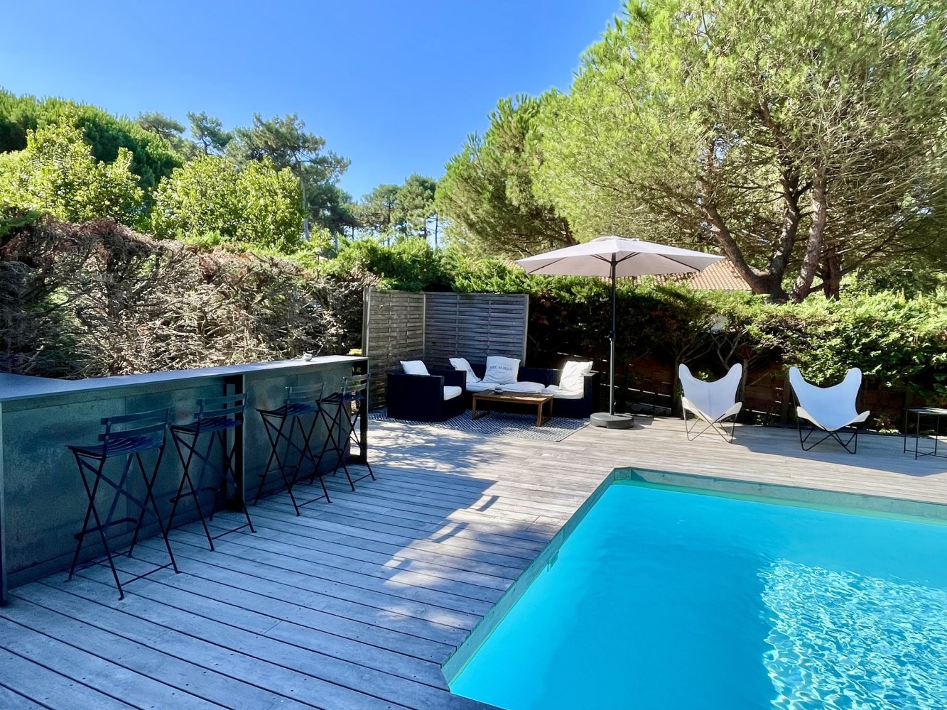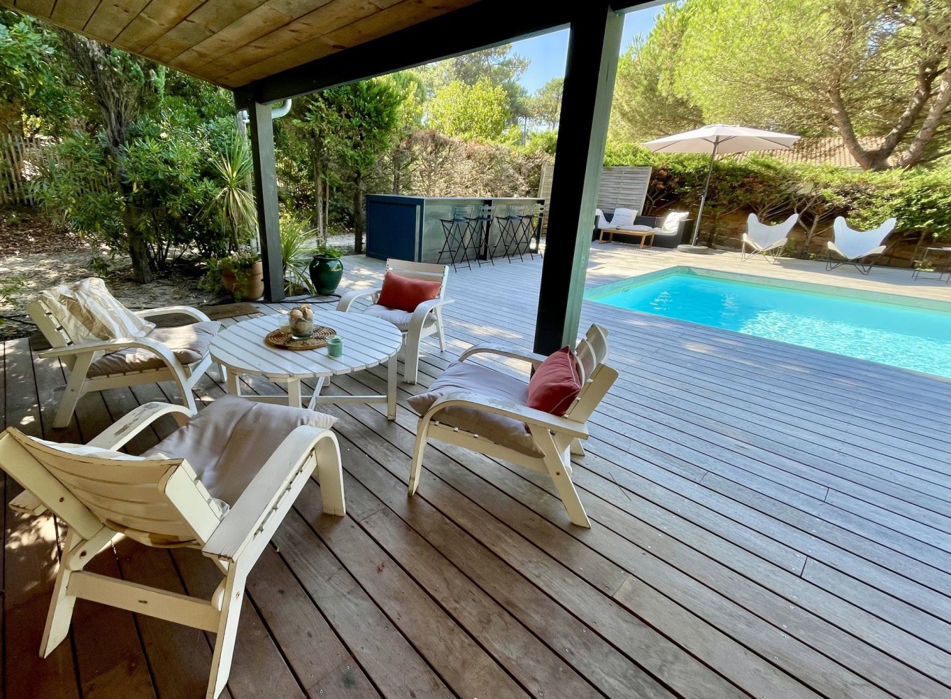 Garden furniture, pool loungers, parasols and barbecue.