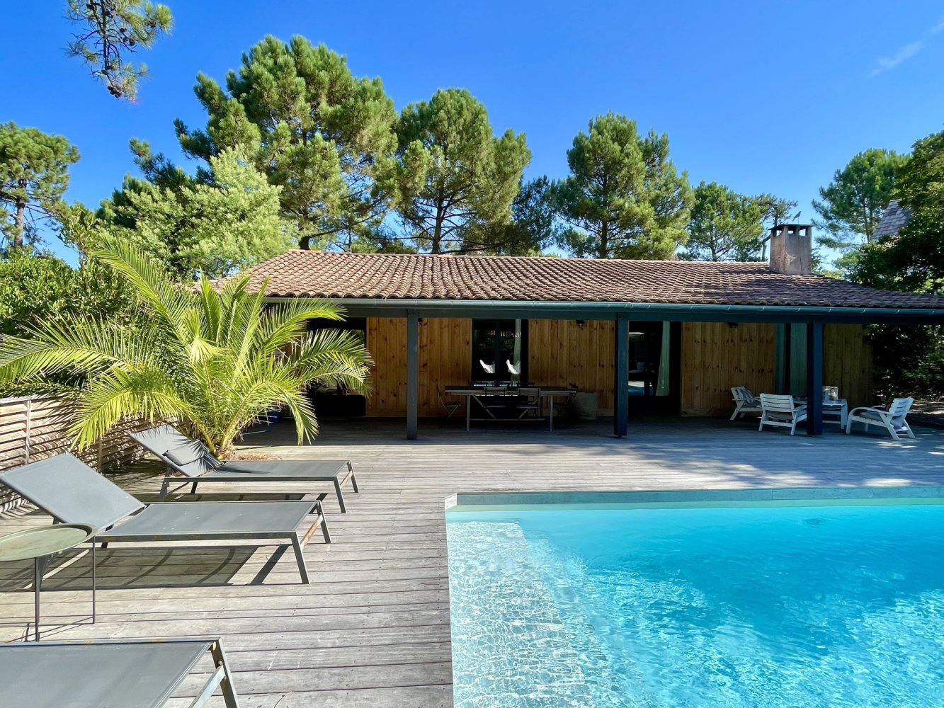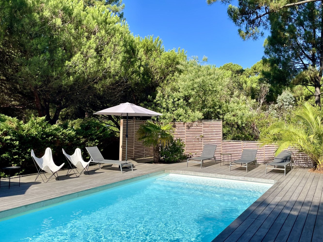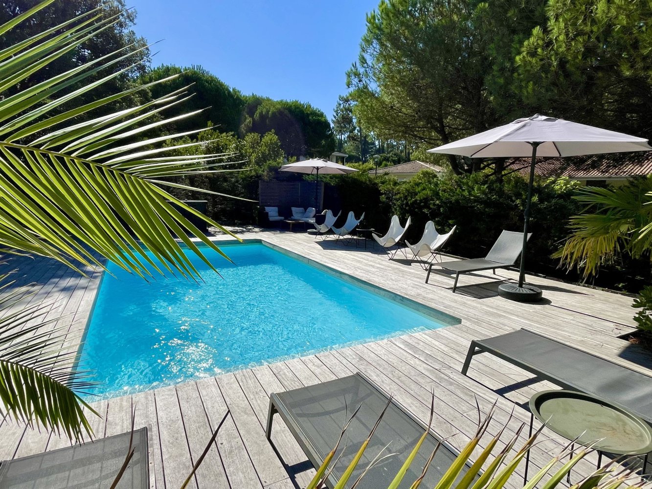 Garden furniture, pool loungers, parasols and barbecue.