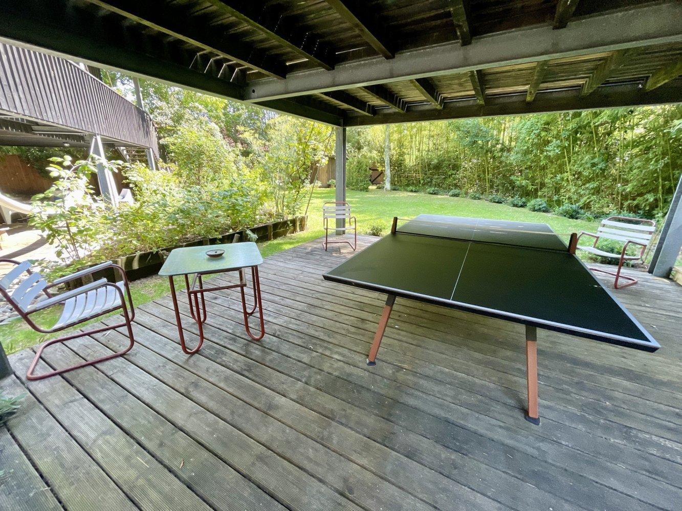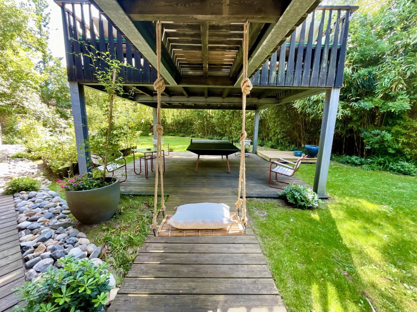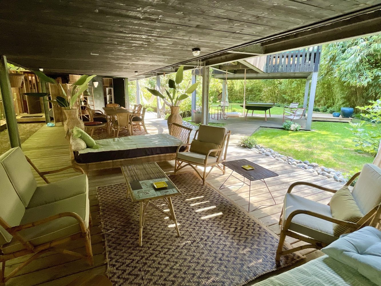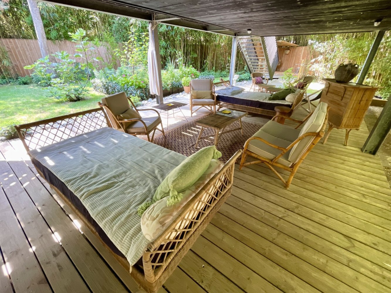 From the living room and all upper rooms, there is access to the large wooden deck above with a dining table and seating area.