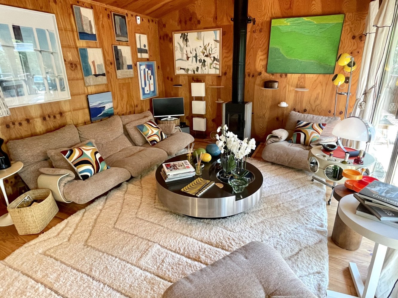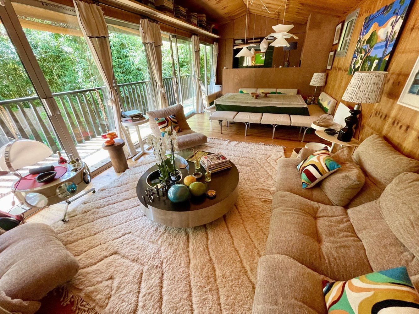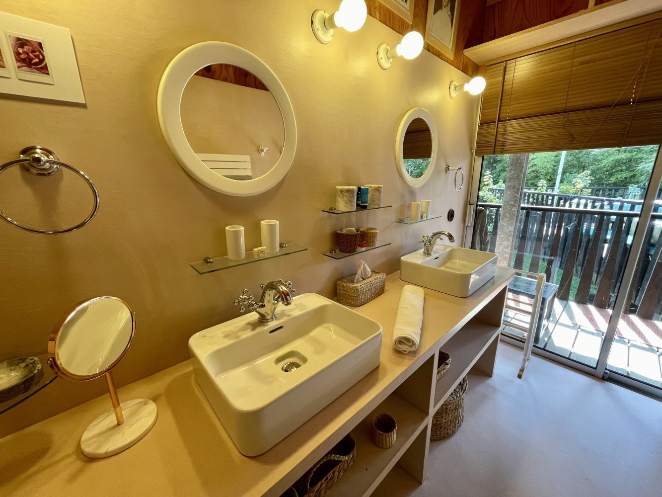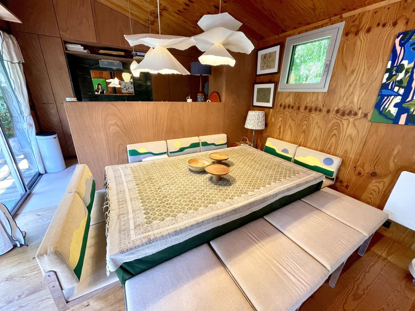 From the living room and all upper rooms, there is access to the large wooden deck above with a dining table and seating area.