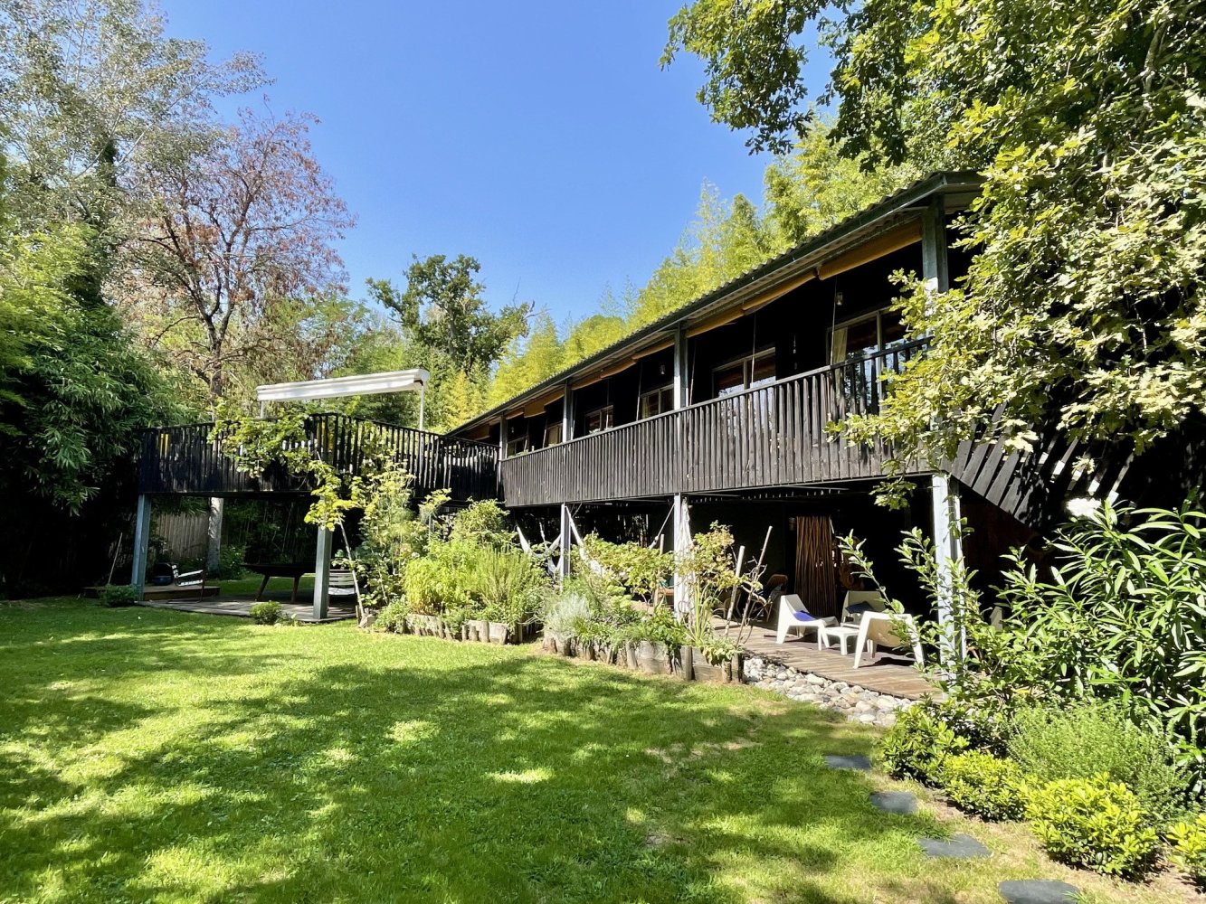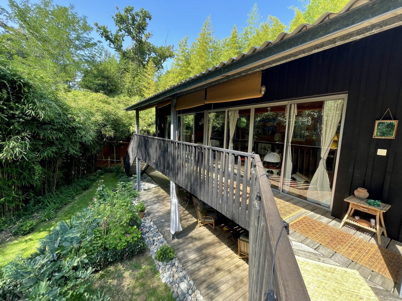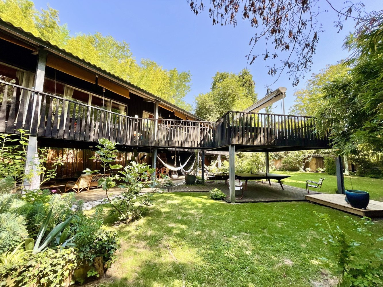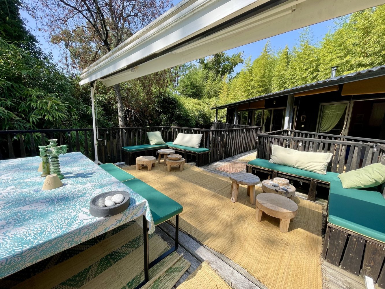 From the living room and all upper rooms, there is access to the large wooden deck above with a dining table and seating area.