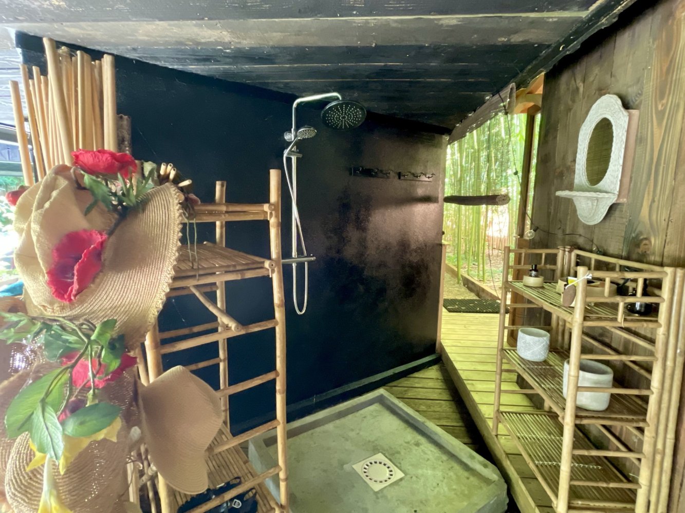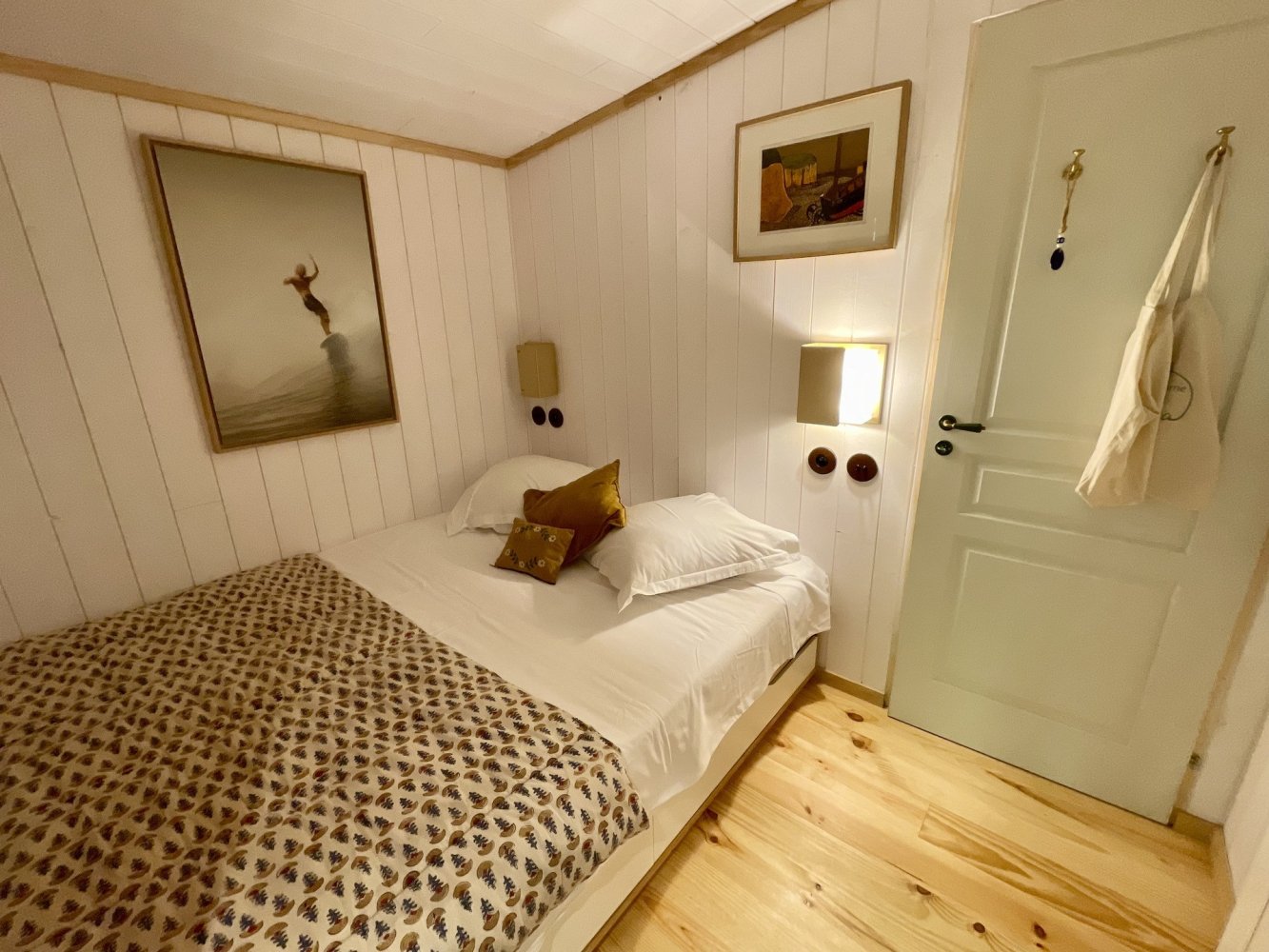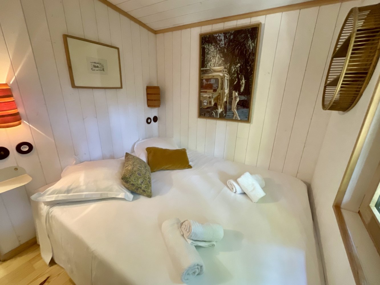 Stunning stilt house with a beautiful garden and spacious terraces and balconies on a gated property in L'Herbe, just a few steps from the bay beach. The main part of the house is accessed via two wooden stairs, one to the right and the other to the left of the terrace. It features a living room with an integrated kitchen, TV, Wi-Fi, a sofa area, and access to the master suite with a 1.60m double bed and a private shower room. From the terrace, there is access to two further bedrooms (one 1.60m double bed and one twin bed (2x0.80m)), which share a shower room and toilet, accessible from both rooms.