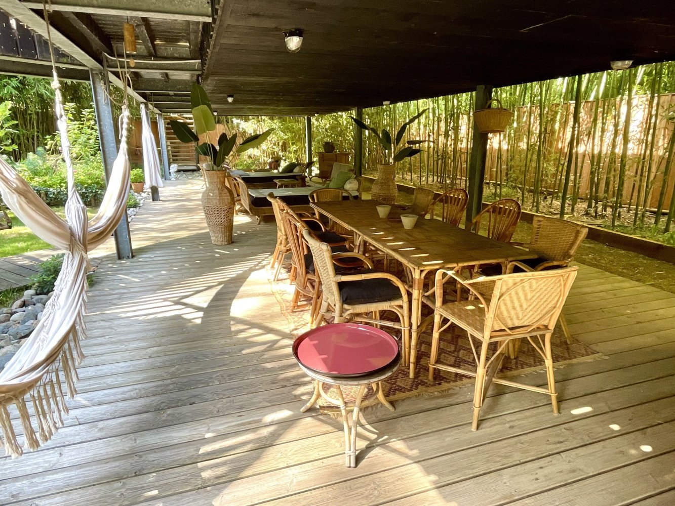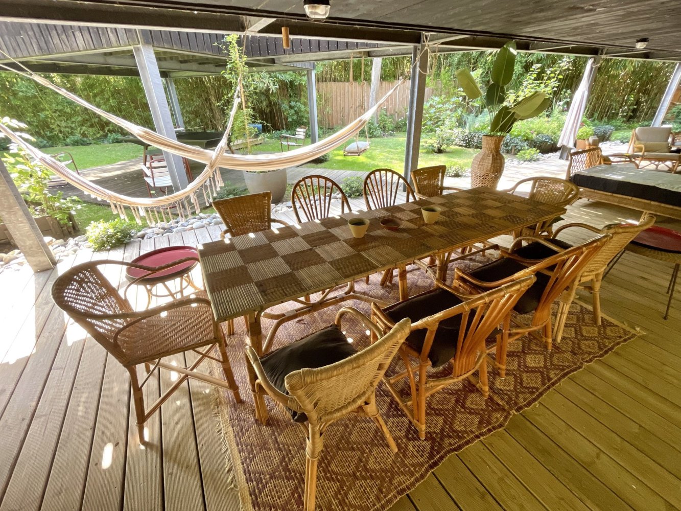 A very large covered lounge terrace below the house offers a variety of seating areas, sun loungers, a dining table, hammocks, and an outdoor shower.