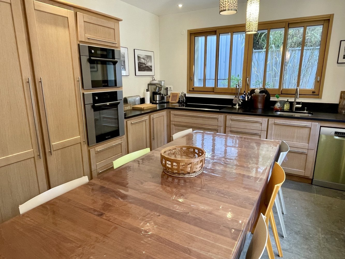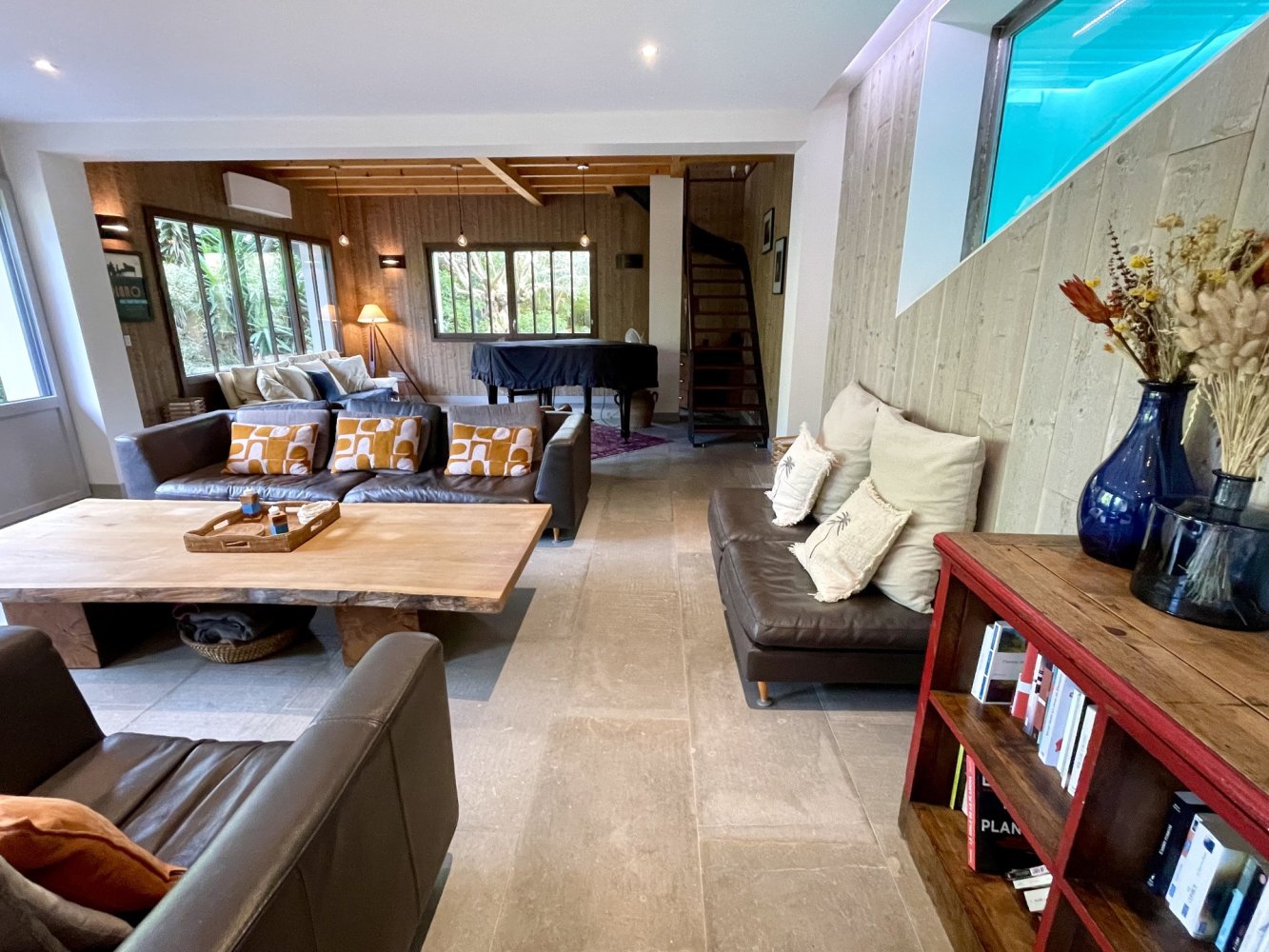 Au rez-de-chaussée vous trouverez le salon spacieux avec canapé, cheminée, TV et piano. Une attraction particulière est la fenêtre vers la piscine. La cuisine de haute qualité est entièrement équipée, salle à manger adjacente et sortie sur la terrasse avec plancha.
