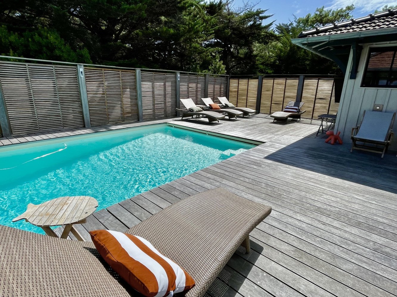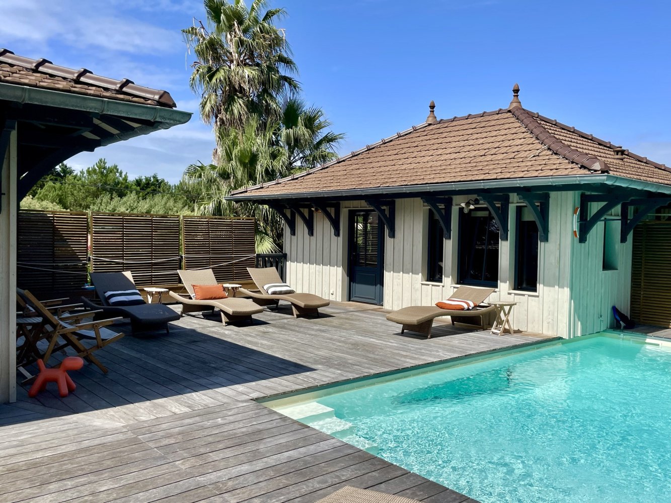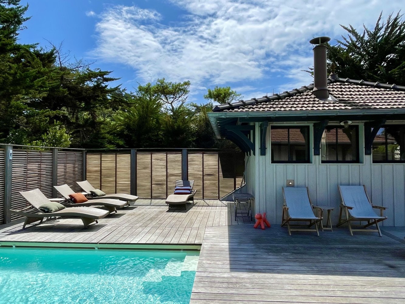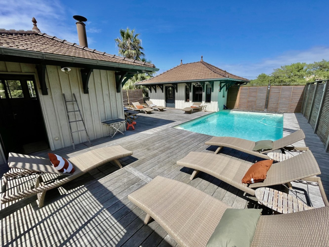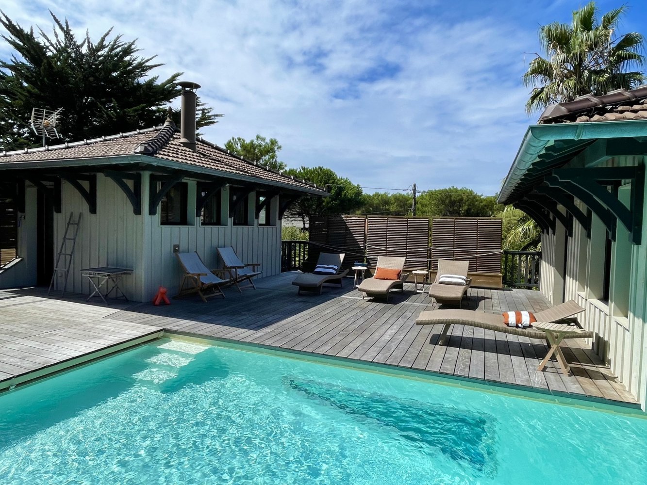 Cette villa exceptionnelle et luxurieuse de tout confort est située sur un terrain de 1000 m² clôturé et merveilleusement paysager, tout près des dunes du Cap Ferret. La villa dispose de 200 mètres carrés d'espace de vie et est répartie sur 2 niveaux. Au deuxième étage vous trouverez la chambre principale avec un lit double, salle de bain privée avec jacuzzi et WC, sortie sur une terrasse fantastique sur le toit avec piscine (chauffée de fin-avril à début-octobre) et vue sur les dunes. Couchers de soleil spectaculaires garantis.