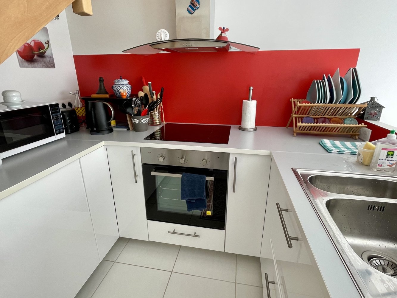 Au rez-de-chaussée se trouvent un coin cuisine ouvert avec table à manger et sortie terrasse, 1 chambre avec un canapé lit 1,40 m et salle d'eau.