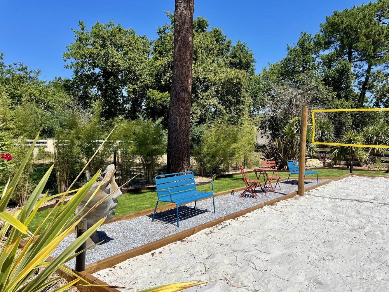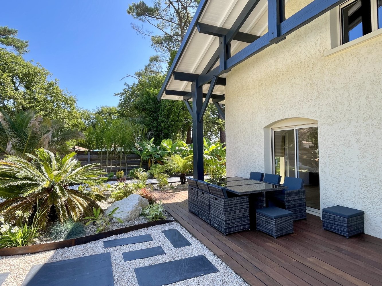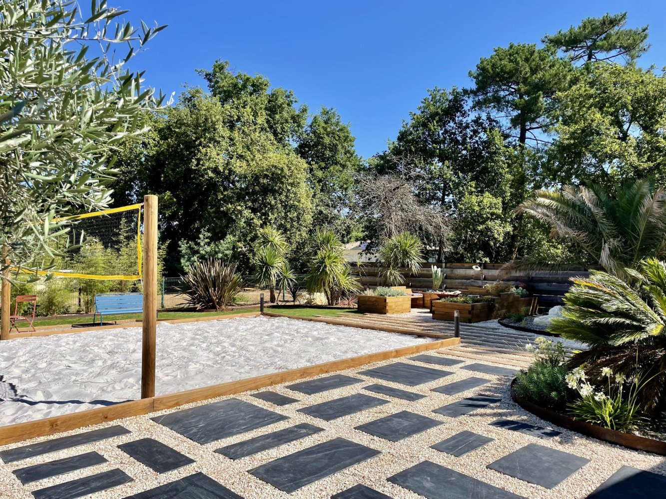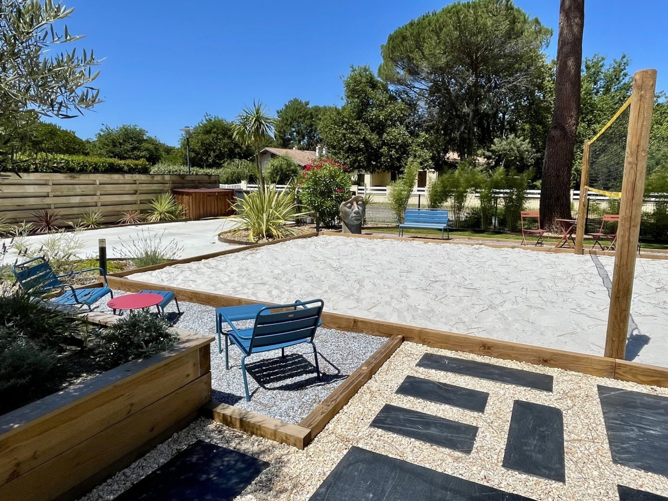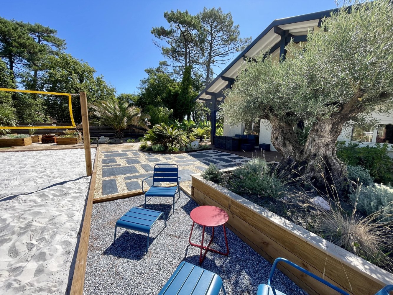 Renoviertes Landaiser Haus mit geheiztem Salzwasser-Pool und Jacuzzi, sehr großzügige Terrassen und gepflegtes Grundstück mit beach volley in ruhiger Lage in Claouey-Cap Ferret Halbinsel. Der Buchtstrand, Geschäfte und Restaurants sind zu Fuß erreichbar.