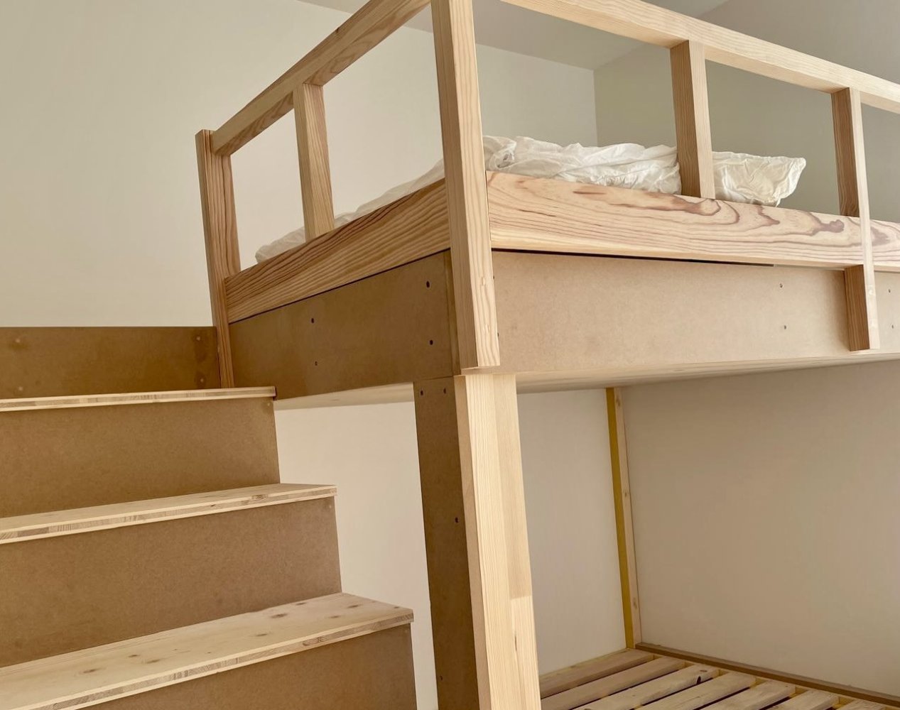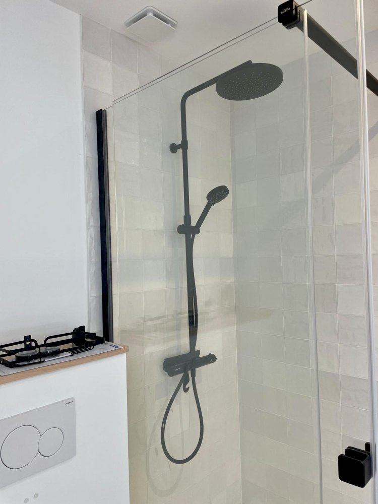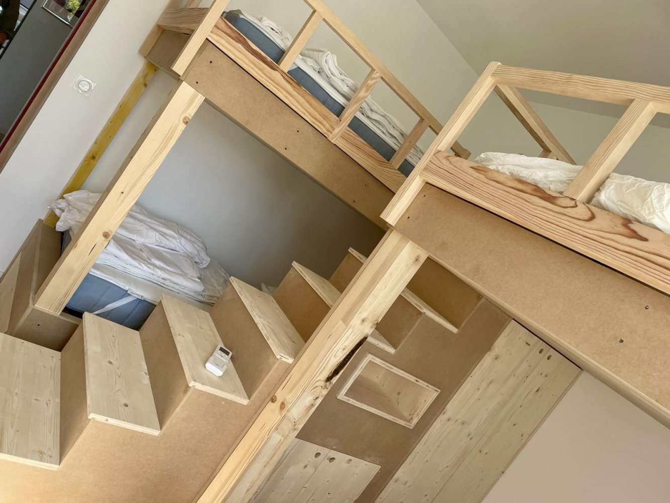 Es gibt 3 Schlafzimmer, davon 2x mit Doppelbett und 1x mit zwei Hochbetten, die je 1 Doppelbett und 1 Einzelbett haben. 1 Duschbad mit WC. 1 weiteres Duschbad und 1 separates WC.