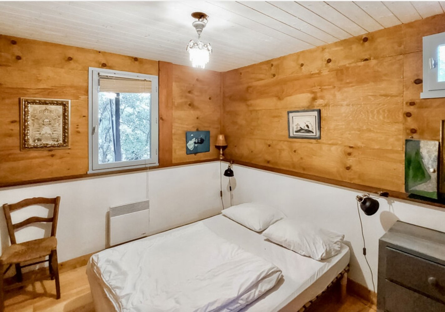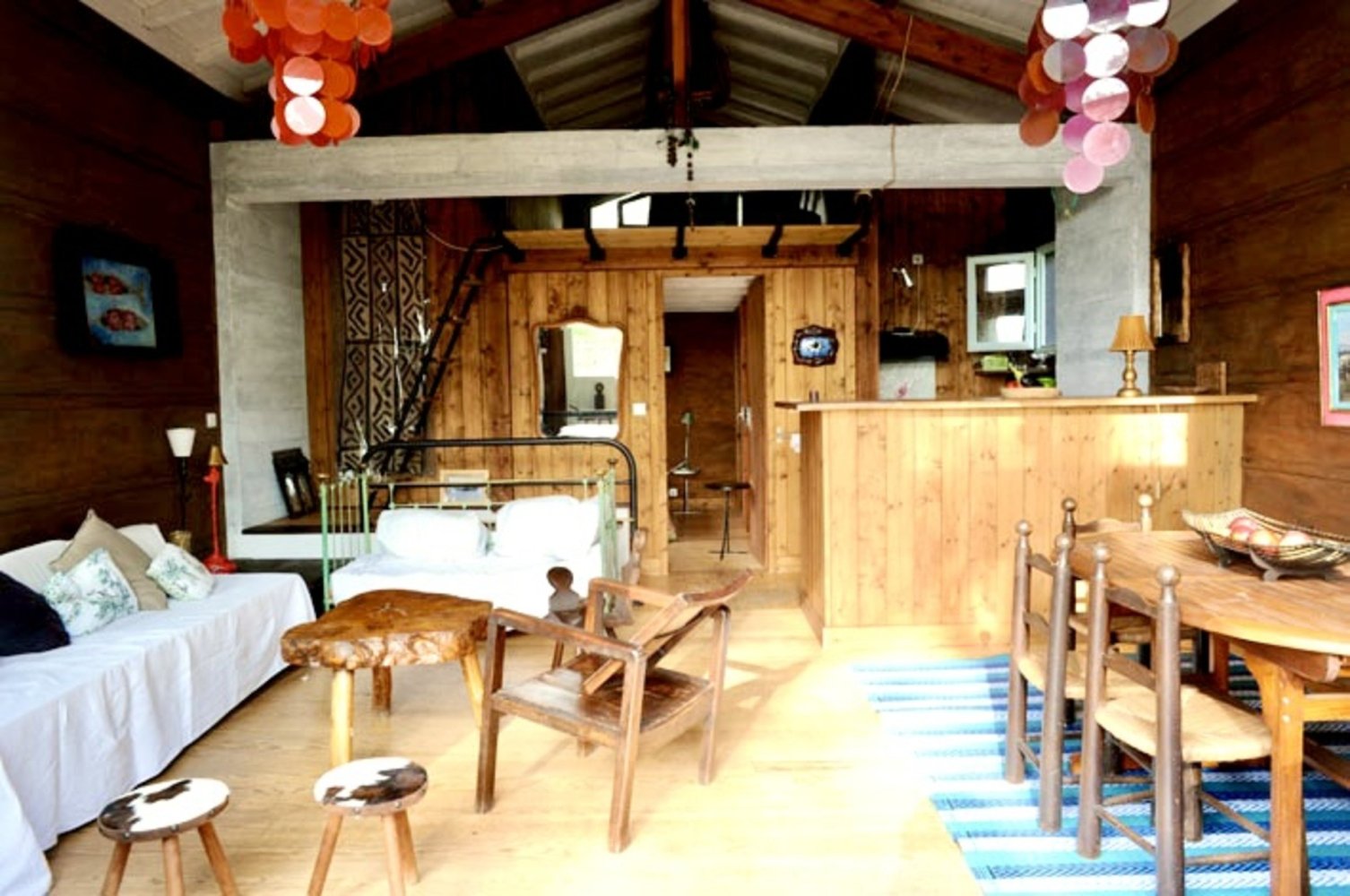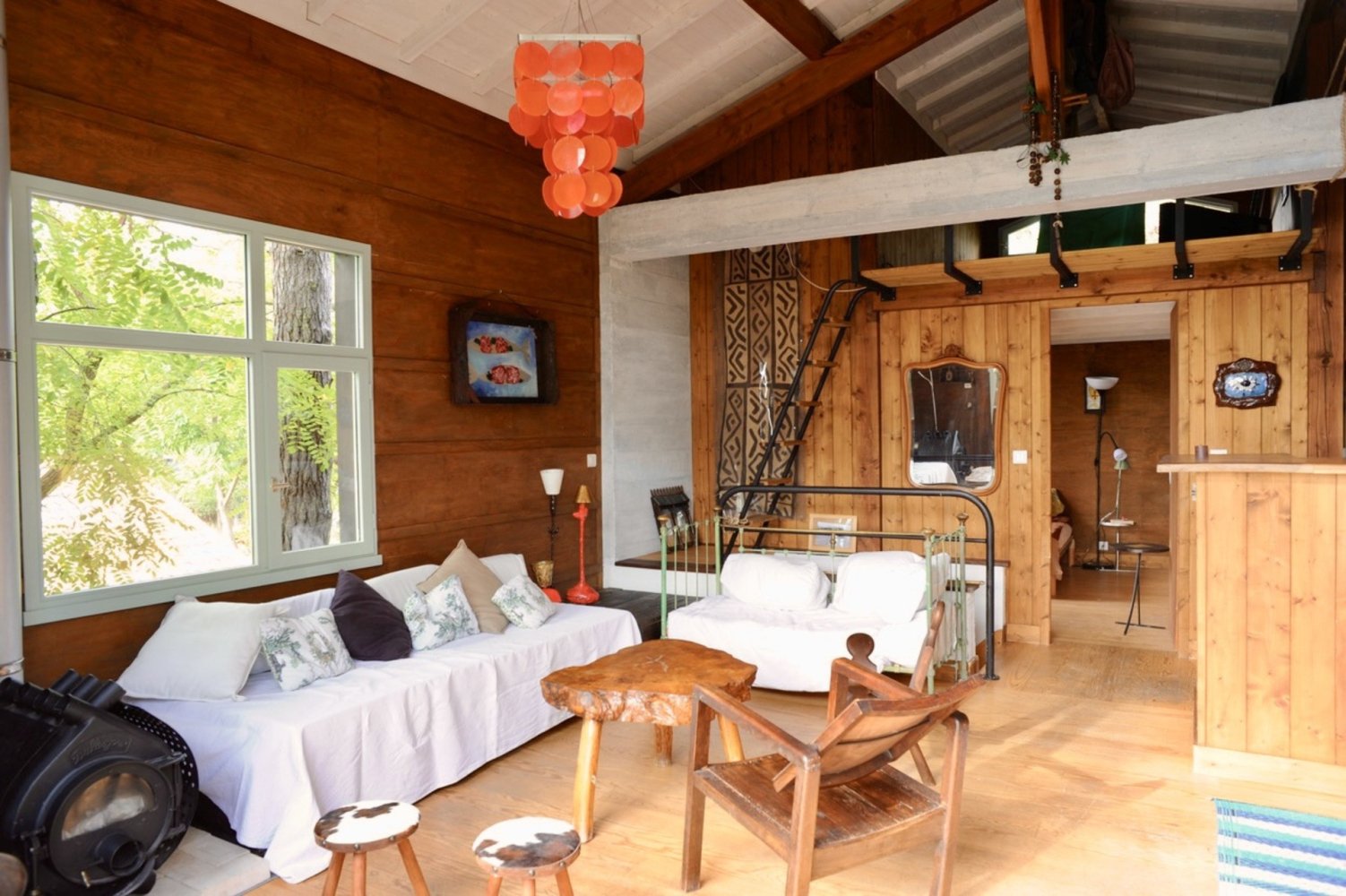 Helles Wohnzimmer, offene und voll ausgestattete Küche (Nespresso-Maschine), Doppelzimmer mit einem 140-cm-Bett, kleines privates Badezimmer mit Dusche und WC sowie Zugang zu einer kleinen Mezzanine mit zwei zusätzlichen Schlafgelegenheiten (Matratzen auf dem Boden).