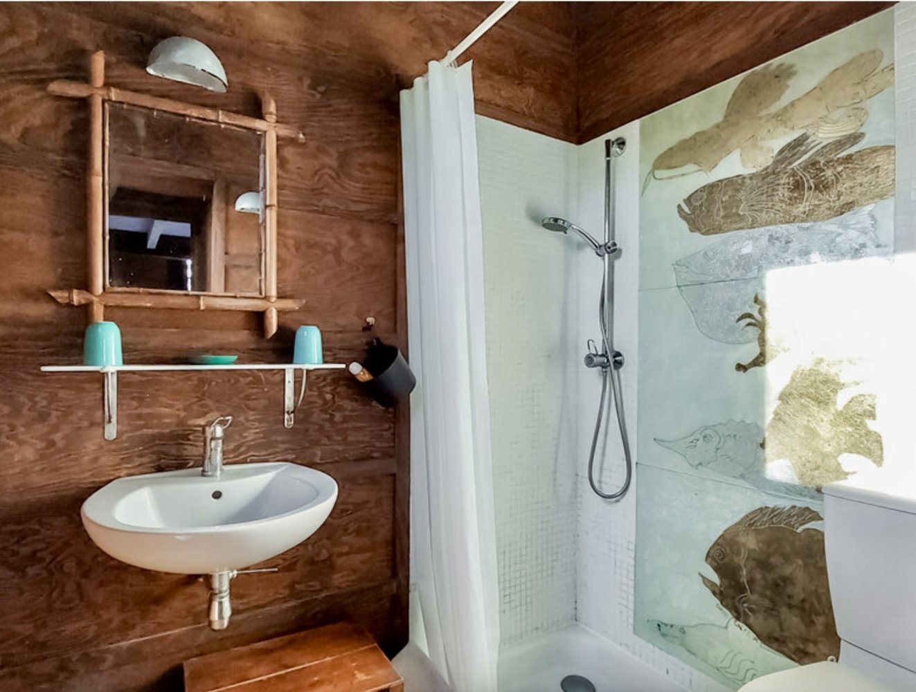 Ein kleines Badezimmer mit Dusche und WC.