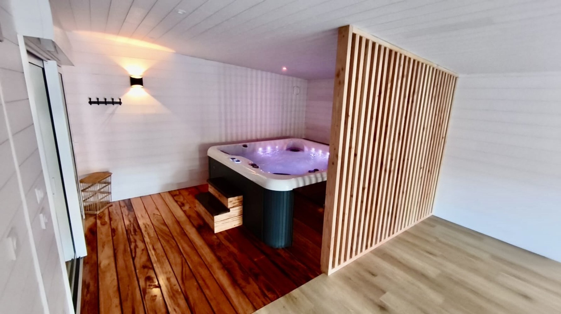 A wooden garden house with private terrace, studio like living space with sofa bed 1.20m and little kitchinette, small single bedroom and shower room.