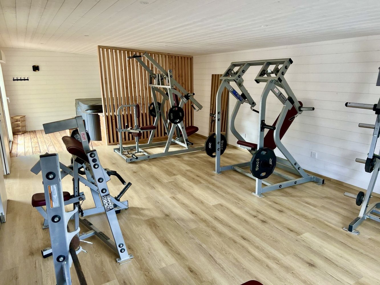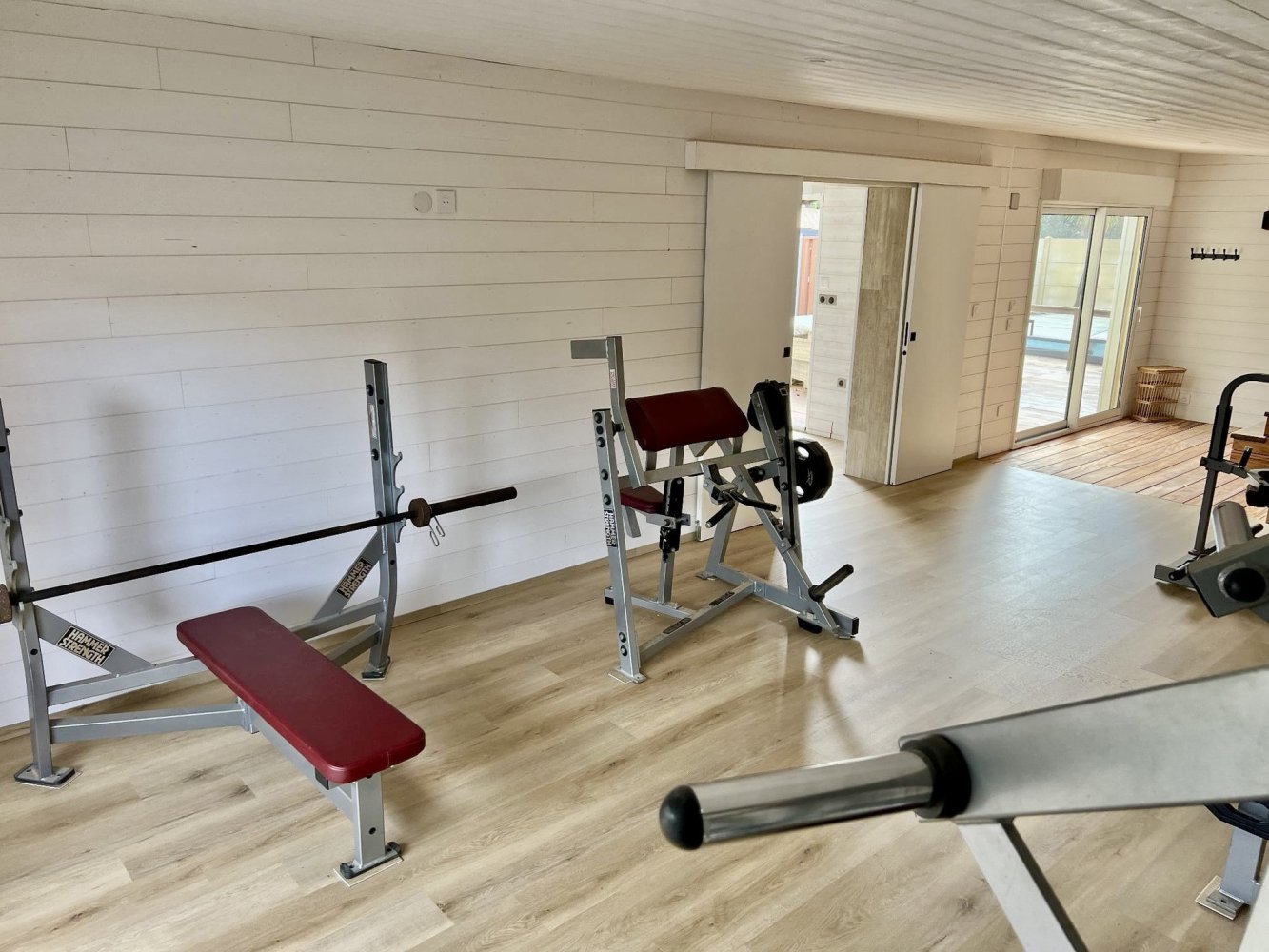 The house has a large living room with an integrated kitchen, sofa corner and TV, dining table, 1 double room, shower room, separate toilet and fitness room.