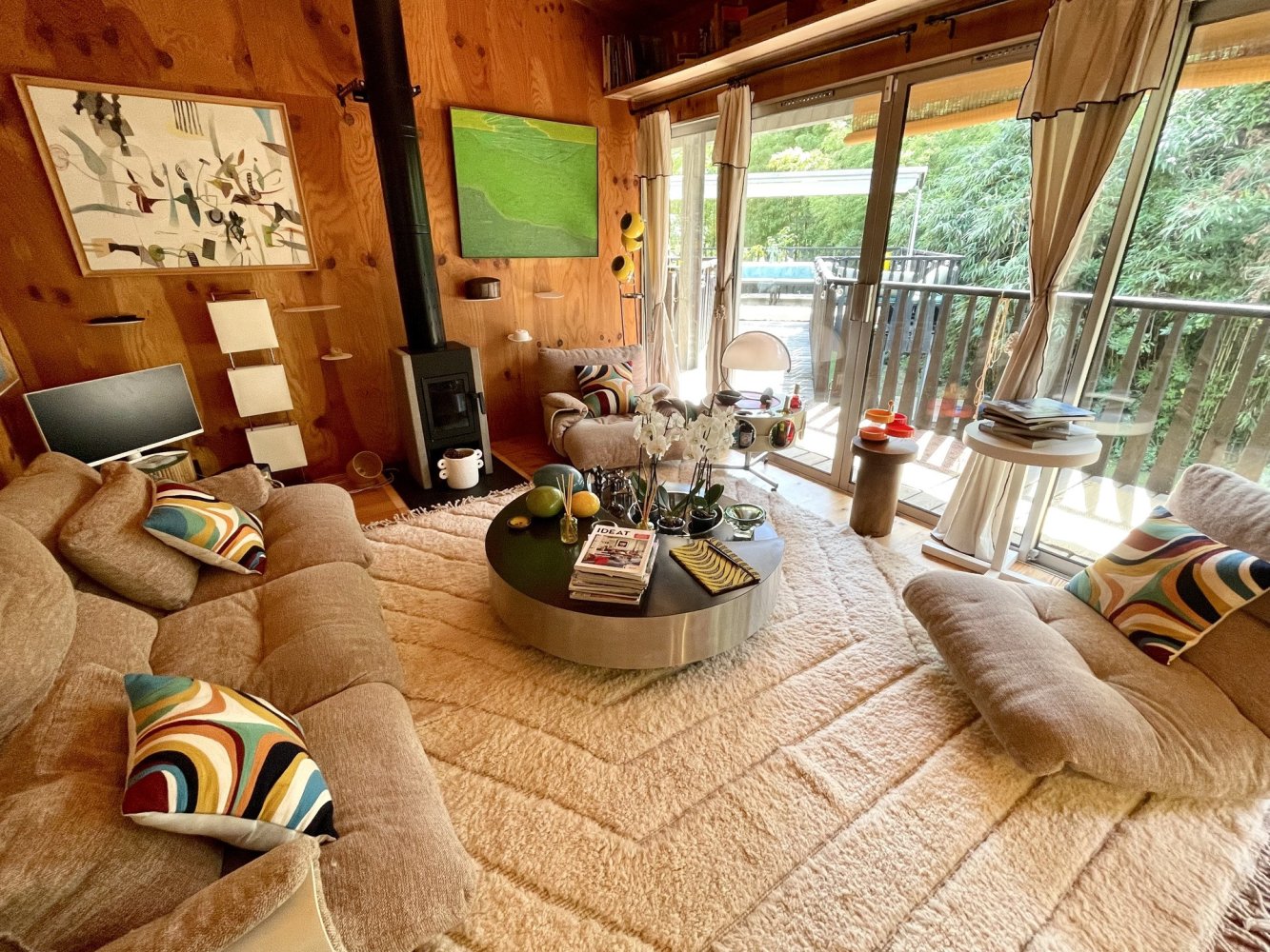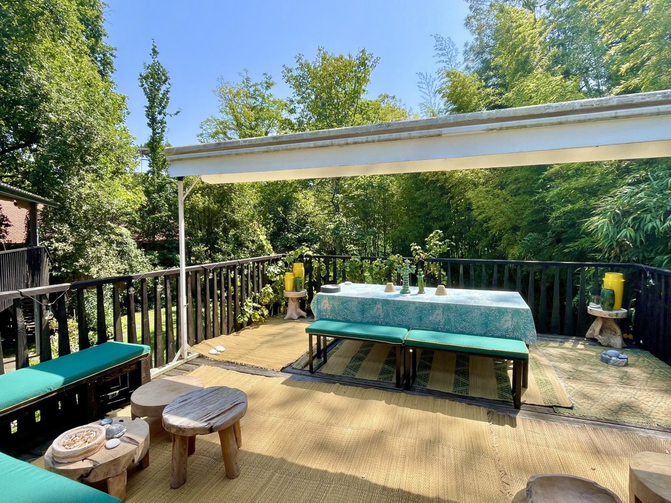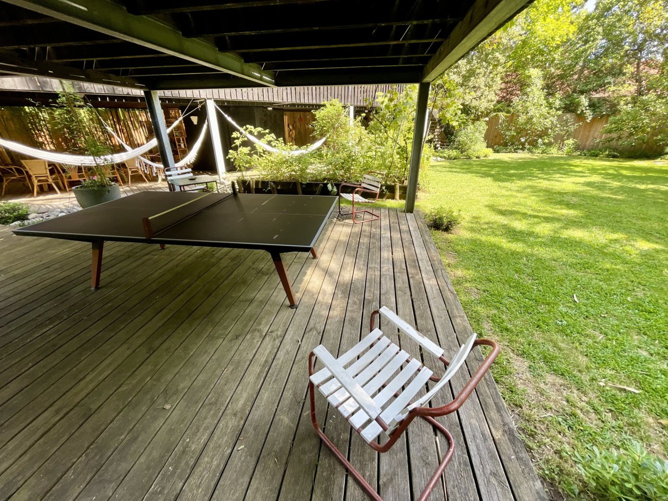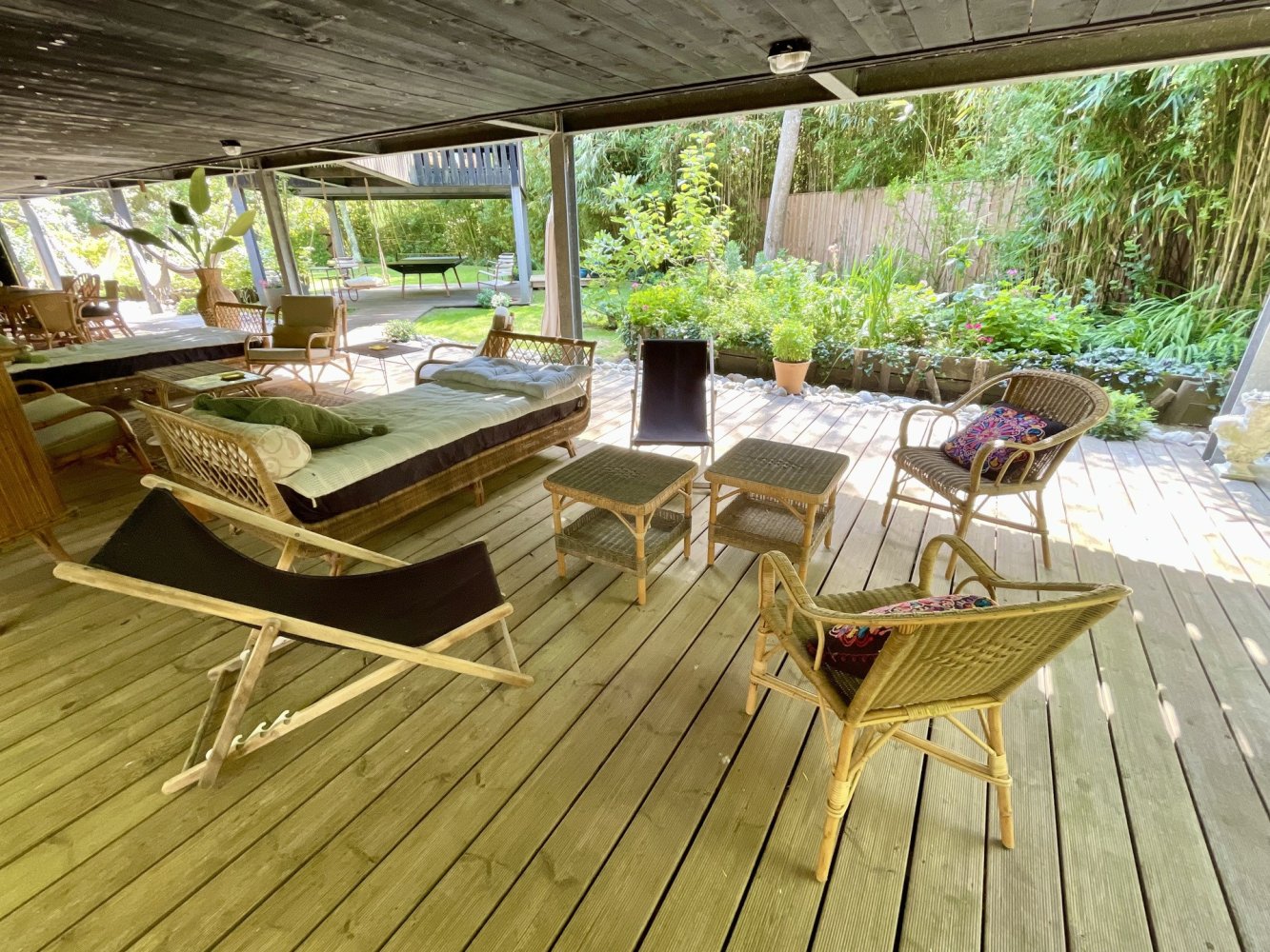 From the living room and all upper rooms, there is access to the large wooden deck above with a dining table and seating area.