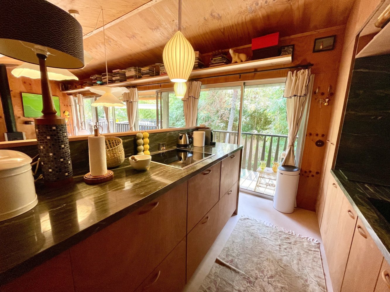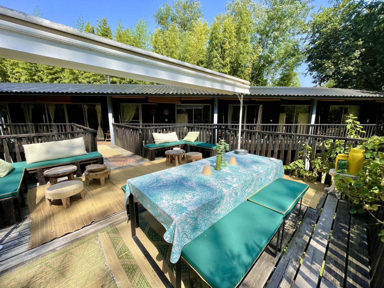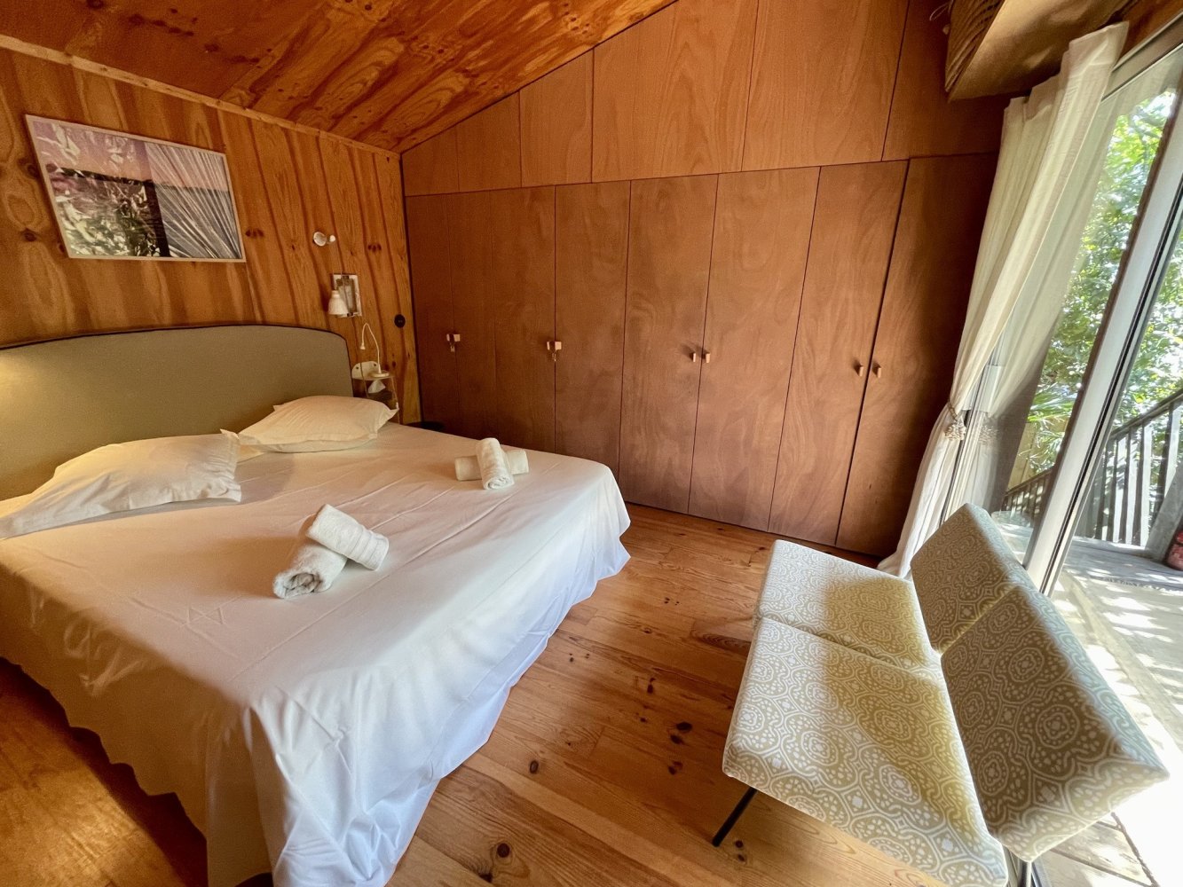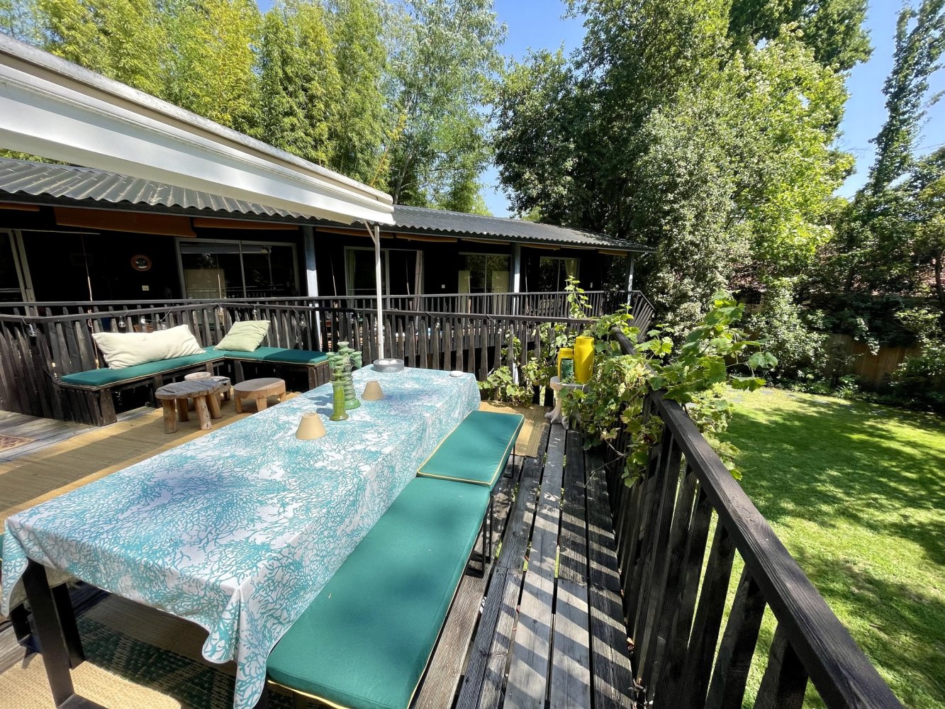 From the living room and all upper rooms, there is access to the large wooden deck above with a dining table and seating area.