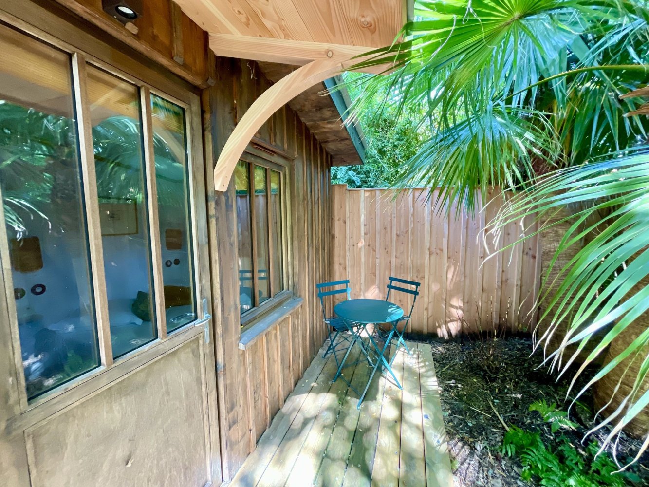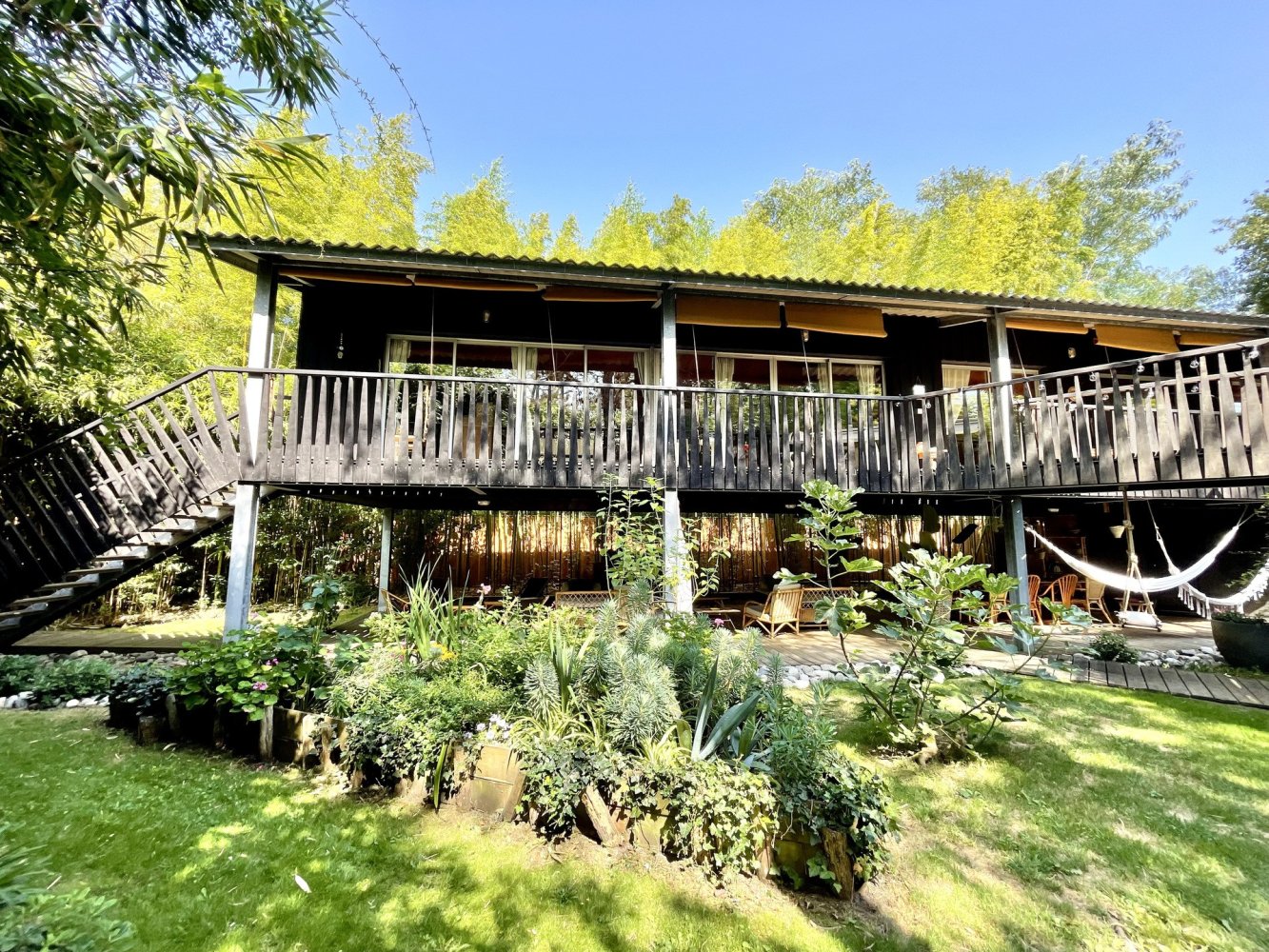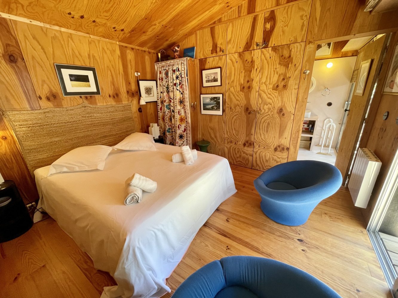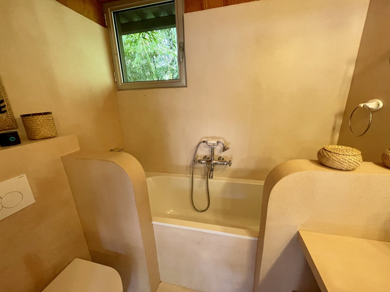 Stunning stilt house with a beautiful garden and spacious terraces and balconies on a gated property in L'Herbe, just a few steps from the bay beach. The main part of the house is accessed via two wooden stairs, one to the right and the other to the left of the terrace. It features a living room with an integrated kitchen, TV, Wi-Fi, a sofa area, and access to the master suite with a 1.60m double bed and a private shower room. From the terrace, there is access to two further bedrooms (one 1.60m double bed and one twin bed (2x0.80m)), which share a shower room and toilet, accessible from both rooms.