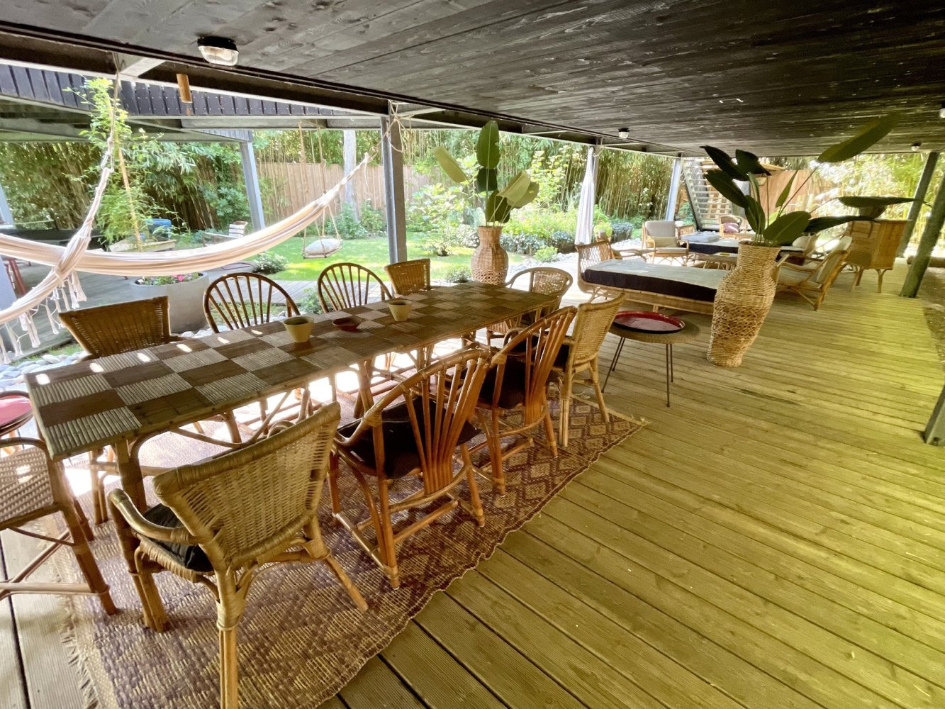 A very large covered lounge terrace below the house offers a variety of seating areas, sun loungers, a dining table, hammocks, and an outdoor shower.