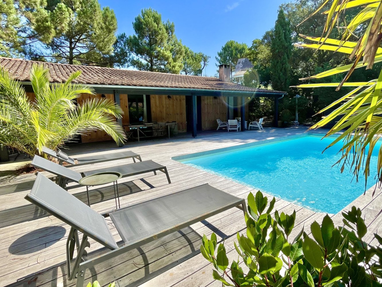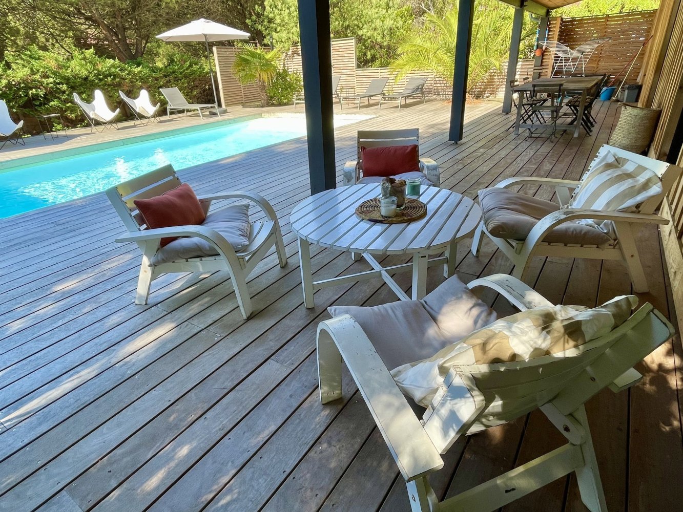Garden furniture, pool loungers, parasols and barbecue.