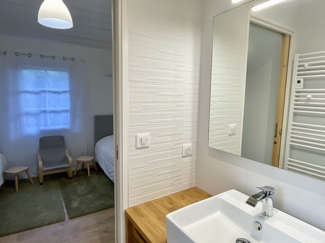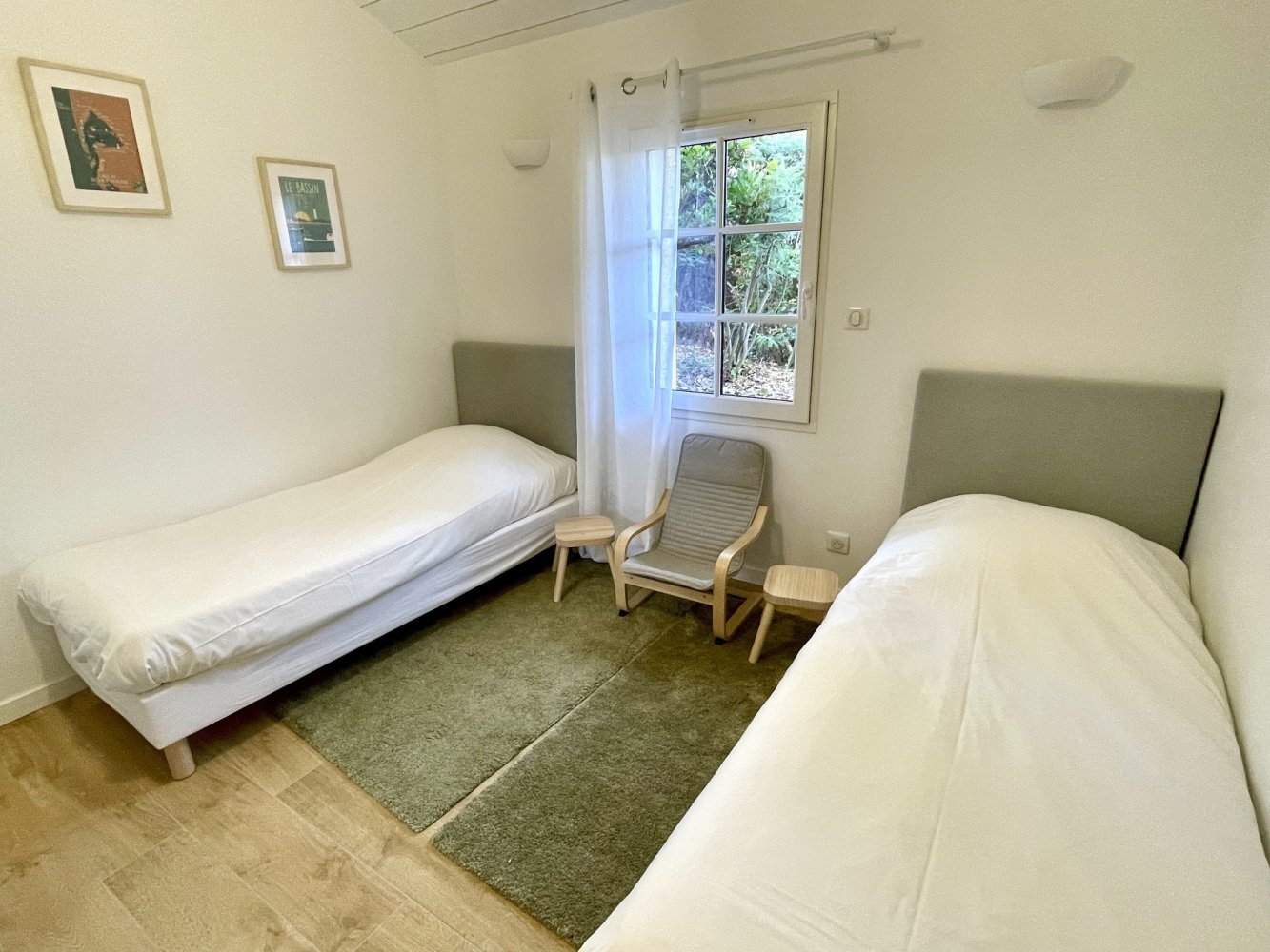 Séjour avec sortie terrasse, coin canapé et cheminée, WiFi, table à manger et cuisine américaine entièrement équipée. 2 chambres avec lit double de 1,80m, 1 chambre avec deux lits simple 0.80m (Twin) et 1 chambre avec 2 lits superposés (4x lit simple). Il y a 3 salles de bains et 3 toilettes (dont 1 WC séparé). Terrasse avec coin salon, plancha et vue bassin depuis les terrasses et les chambres. Parking gratuit devant la propriété.