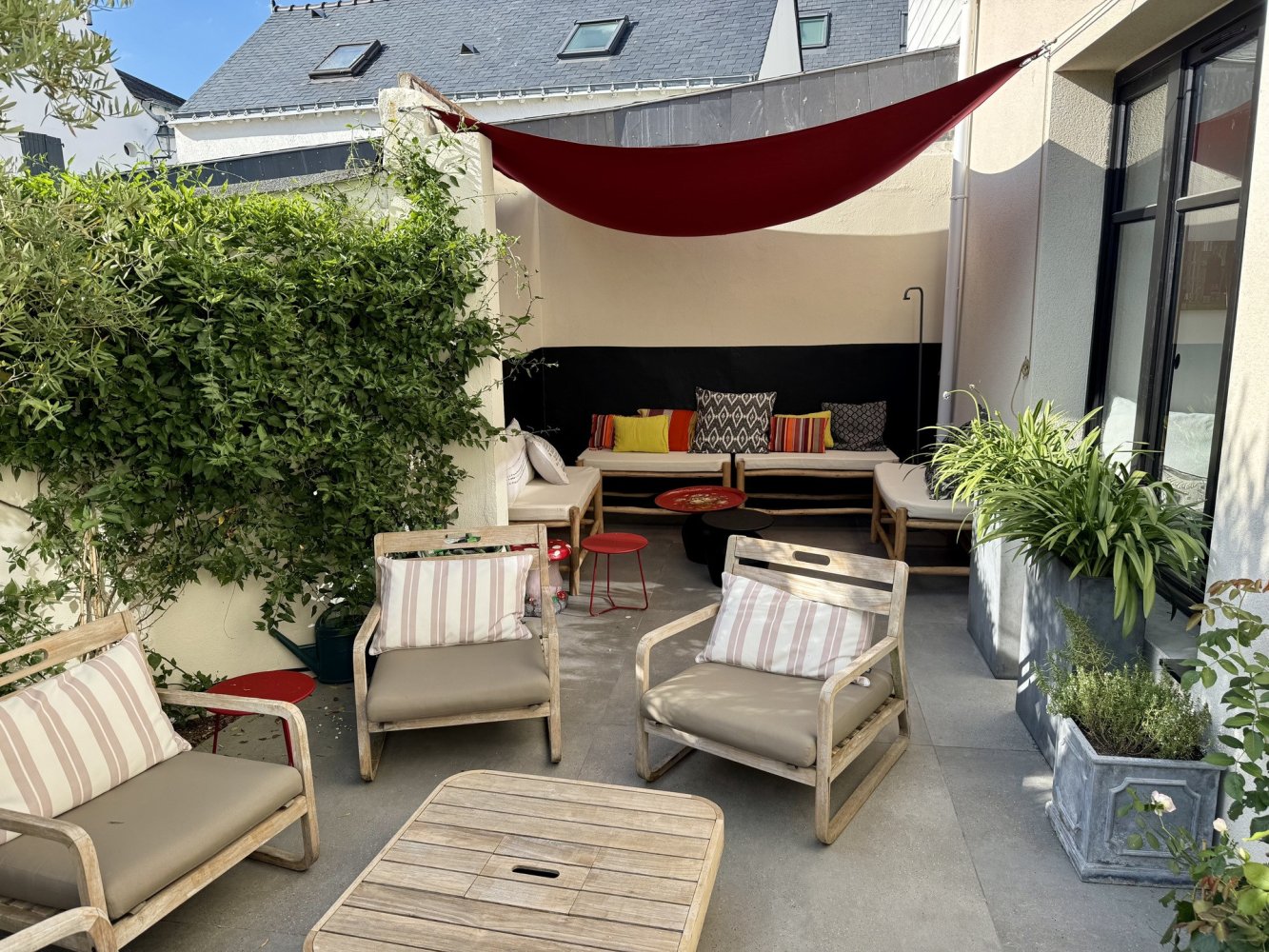 Belle terrasse avec des coins salons extérieurs conviviales et BBQ. Parking public à 150m de la maison et possibilité à déchargé la voiture devant la maison.